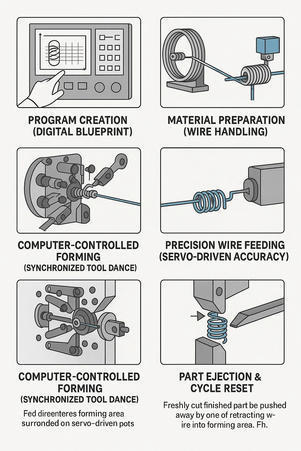 Вот как пружинный станок с ЧПУ работает, разбитый на его основные функции, разбитые на основные функциональные этапы: