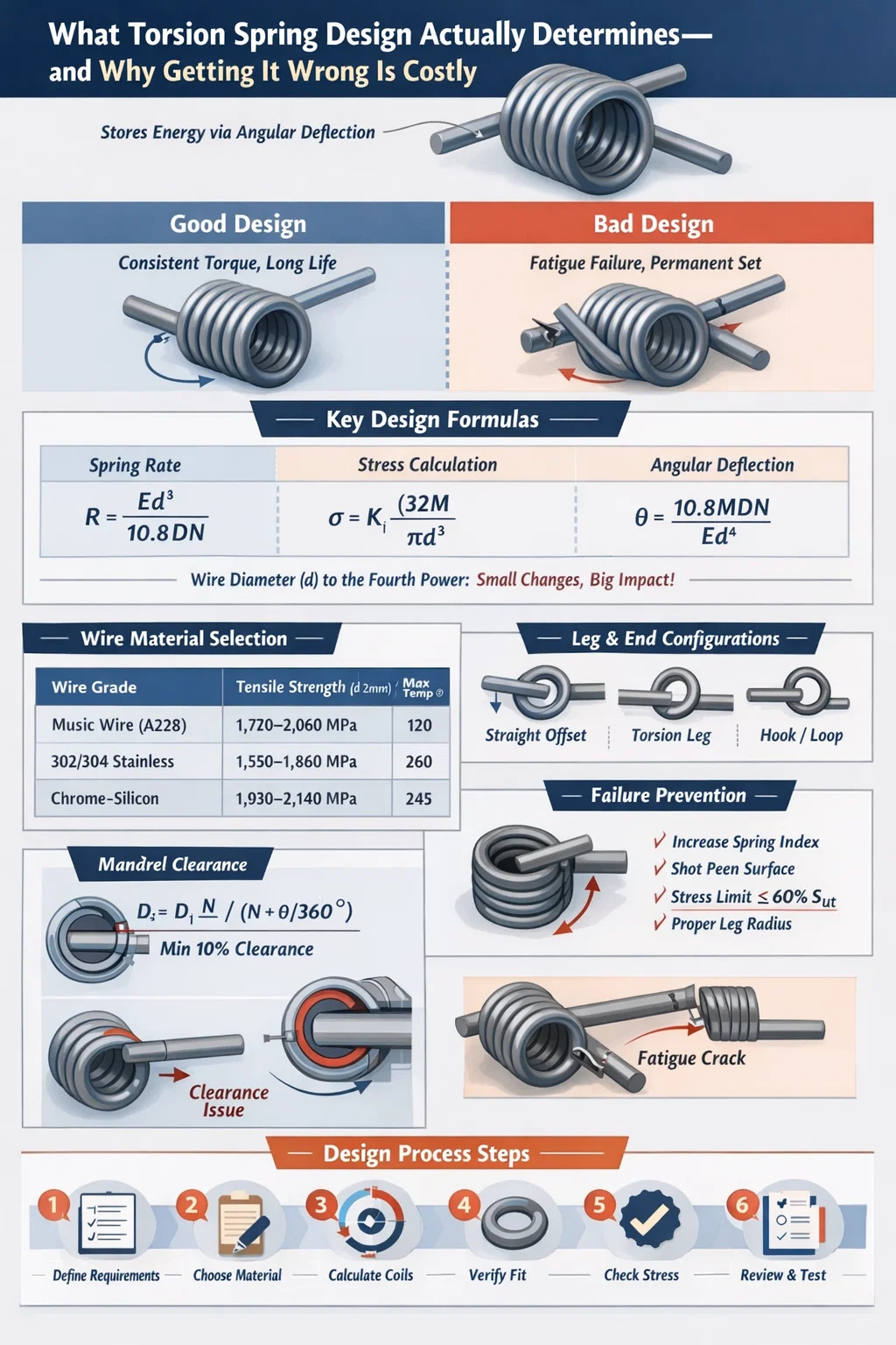 Конструкция торсионной пружины основана на наборе общепризнанных механических уравнений. Их понимание не является обязательным — они определяют, выдержит ли ваша пружина свой срок службы или выйдет из строя в течение первых нескольких тысяч циклов.