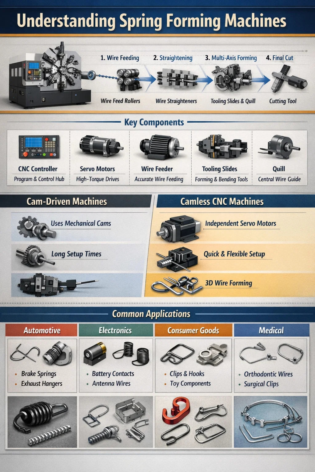 Modern camless spring forming machines use independent servo motors for every tool slide. This allows for instantaneous adjustments via software. Key benefits include: