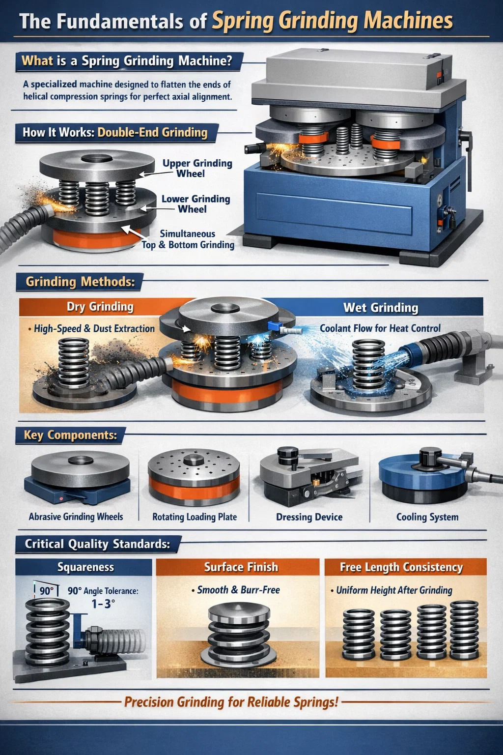 А пружинный шлифовальный станок представляет собой специализированный промышленный абразивный инструмент, разработанный специально для выравнивания концов винтовых пружин сжатия. В производственном мире пружины, выходящие из навивочной машины, часто имеют «открытые» или неровные концы. Без шлифовки эти пружины не могут стоять идеально вертикально или равномерно распределять вес при сжатии. пружинный шлифовальный станок удаляет излишки материала с верхних и нижних рулонов, создавая плоскую, перпендикулярную поверхность.